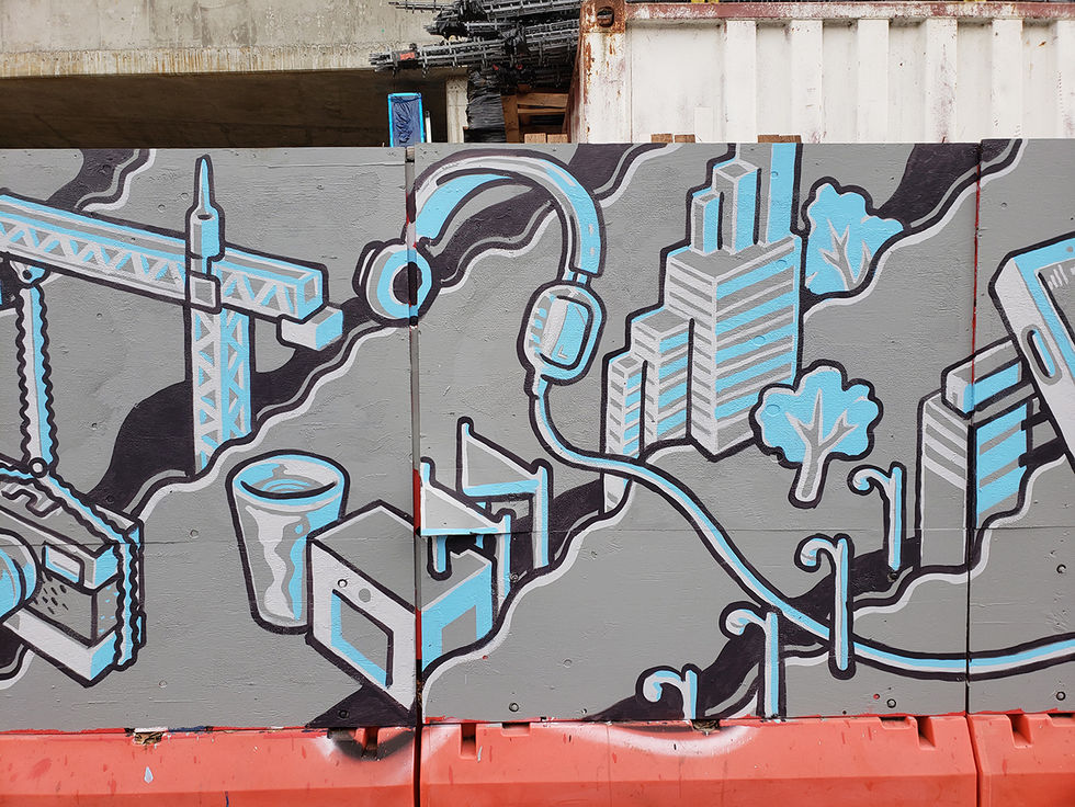 This mural was painted on a temporary plywood façade surrounding a large construction site on the corner of Shattuck Avenue and Center Street in Berkeley, California. The eight foot tall mural wraps around two sides of the building for a total length of over 350 feet. The content of the piece is universal and positive, featuring local landmarks and relevant iconography in a isometric urban landscape. Everything is depicted in a simple, eye-catching palette of the client's brand colors. A small scale sample illustration was approved ahead of time to define style and palette, but then the actual installation was done with no planning, guides, projectors, or pencils. The entire piece was painted painted solo, by hand, with brushes and house paint in early 2020.