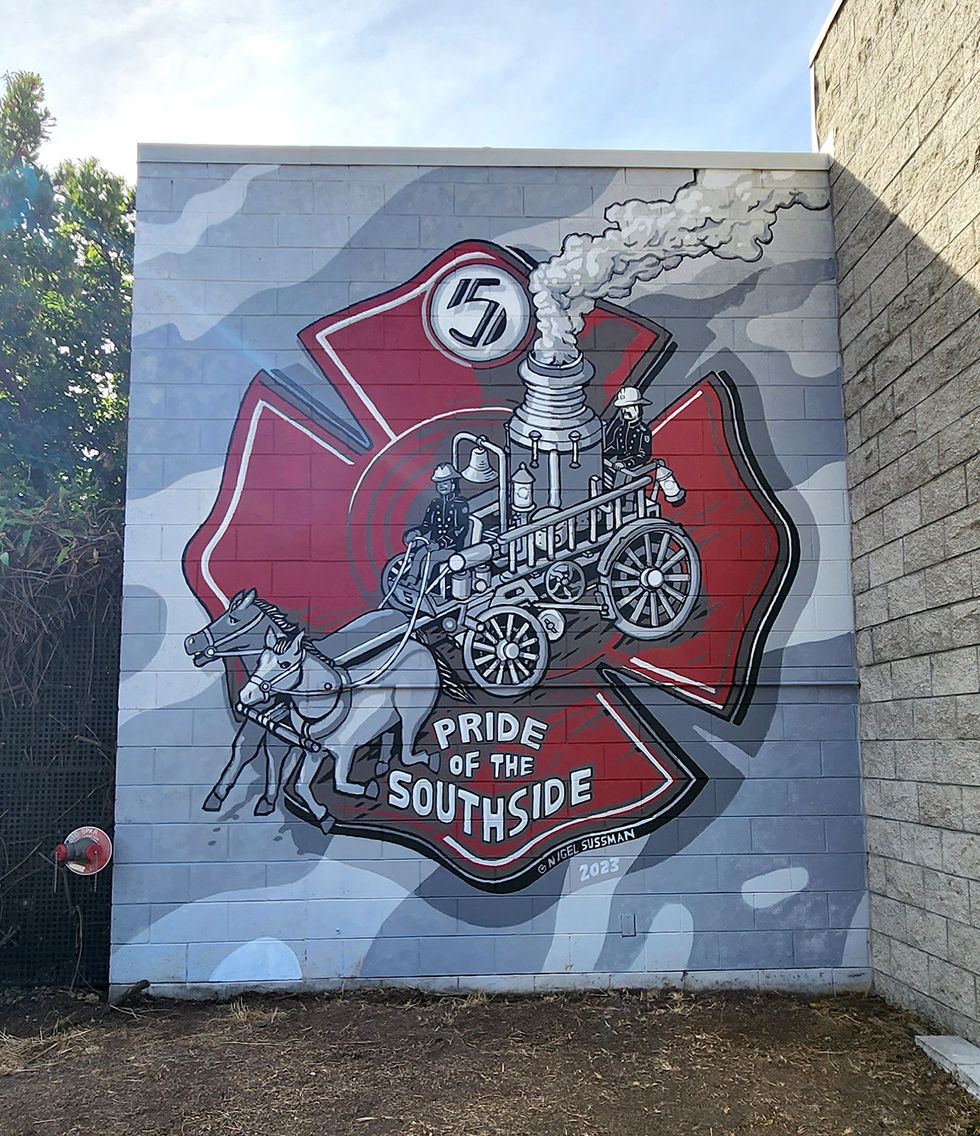 This mural was donated to the Berkeley Fire Department and is approximately 14ft x 17 ft. and is located on the exterior of Station 5 on Shattuck Avenue in Downtown Berkeley. CA. The painting depicts a stylized version of the official Station crest.